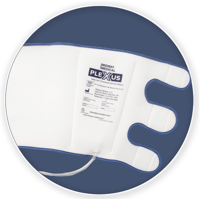 Plexus DVT Sleeves are the first single chamber sleeves that are FDA approved for use with most single chamber DVT compression pumps. Our DVT sleeves are designed to increase blood velocity and aid in the prevention of venous thrombosis embolism, deep vein thrombosis, and pulmonary embolism.